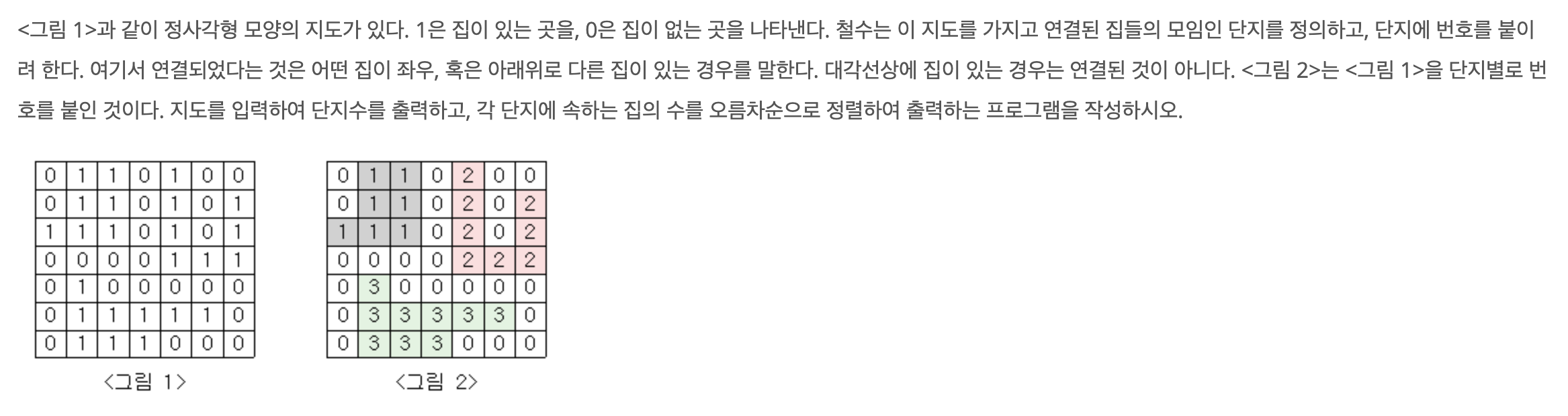 첫 번째 줄에는 총 단지수를 출력하시오. 그리고 각 단지내 집의 수를 오름차순으로 정렬하여 한 줄에 하나씩 출력하시오.