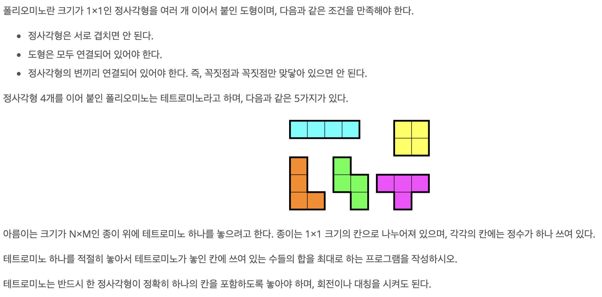 이 문제는 4개짜리 테트로미노 블럭을 주어진 이차원 배열에 놨을 때 배열의 값의 합이 최대가 되는 값을 구하는 문제입니다. 폴리오미노의 조건은 아래와 같습니다. 정사각형은 서로 겹치면 안된다. 도형은 모두..