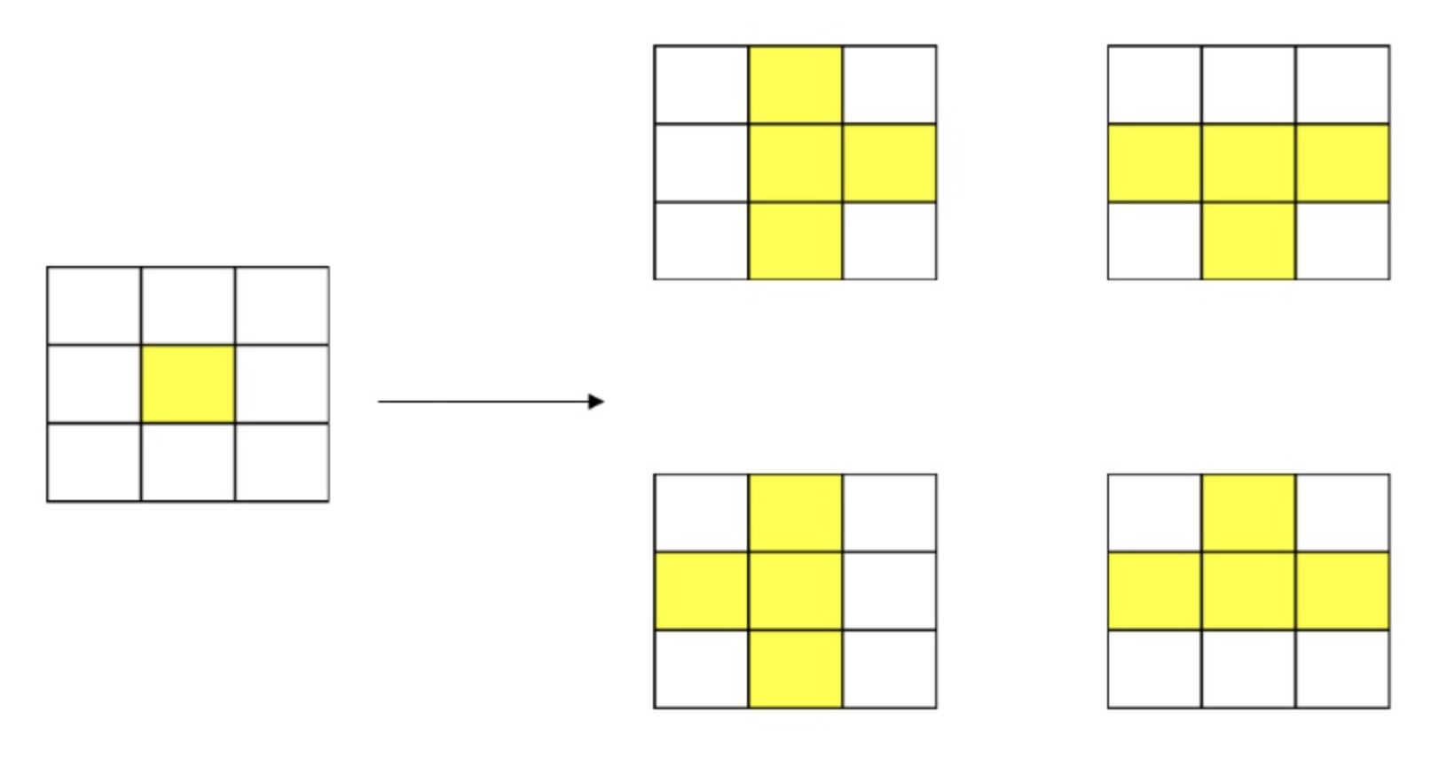 오른쪽을 탐색한다고 예를 들었을 때, 4가지 경우의 수로 'ㅜ'를 제외한 블록들을 표현한다. 즉, 깊이 4만큼만 탐색하면 자연스럽게 전부 해당이 된다는 것을 의미한다. 함수명은 dfs()로 하겠다.