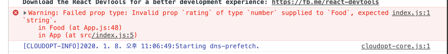 동작에는 문제가 없지만 inspect로 들어가서 console을 확인하면 기대하지 않는 타입이라는 것을 알 수 있다.